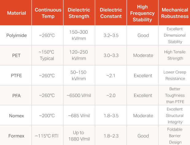 Perfluoroalkoxy (PFA) film, combines strong dielectric performance with improved mechanical durability compared to PTFE while maintaining similar chemical inertness.